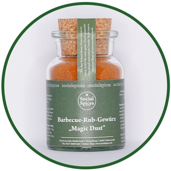 Der Barbecue-Rub-Gewürz "Magic Dust" verleiht Fleisch beim Grillen, Braten oder Backen eine ausgewogene Würze und intensive Aromen. Besonders geeignet für Spareribs, sorgt die sorgfältige Gewürzmischung für eine knusprige Kruste und veredelt den Geschmack, ohne ihn zu überlagern. Ideal für alle, die beim Zubereiten von Fleisch höchste Ansprüche an Geschmack und Qualität stellen.